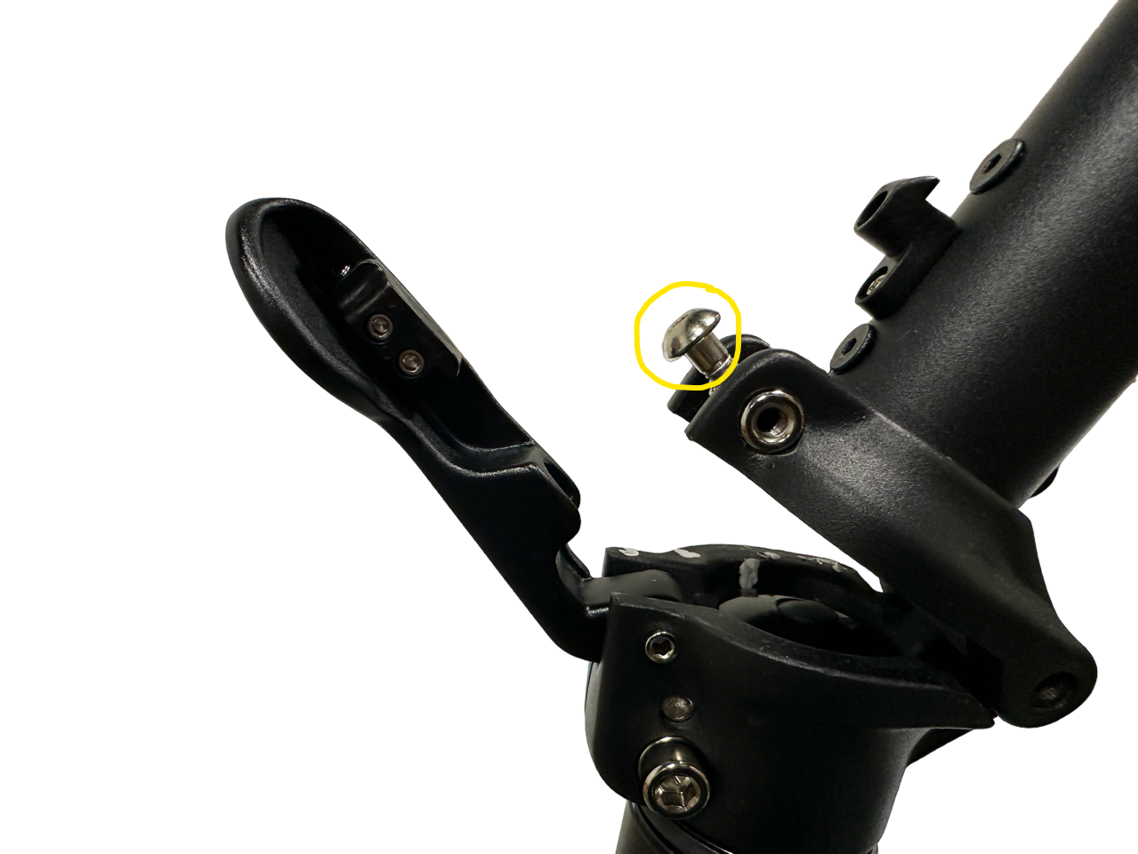 Skruva utåt lite på den markerade insexskruven och prova sedan att låsa fast vikmekanismen och känn efter om glapp kvarstår i styrstag. Kvarstår glapp, så skruva ytterligare utåt på skruven fram tills att styrstag inte glappar. Går det inte låsa fast vikmekanismen? Då har du förmodligen spänt den för mycket. Skruva då inåt istället på insexskruven.