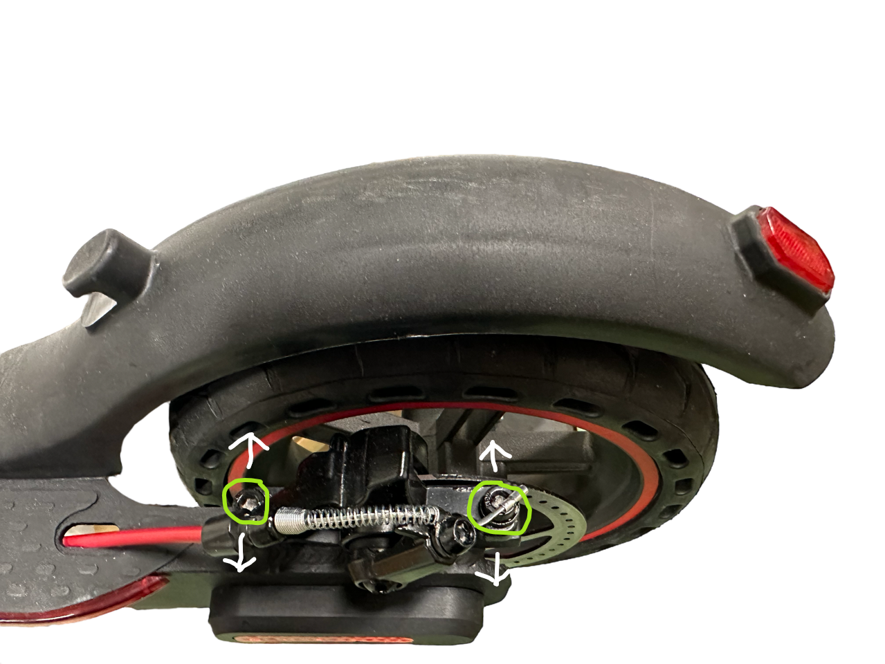 1. Du behöver spela med de 2 skruvarna(Grön markerade) genom att flytta dem horisontellt enligt (Röda pilar). Så snart bromsen inte skaver, skruva tillbaka de 2 skruvarna i rätt läge.