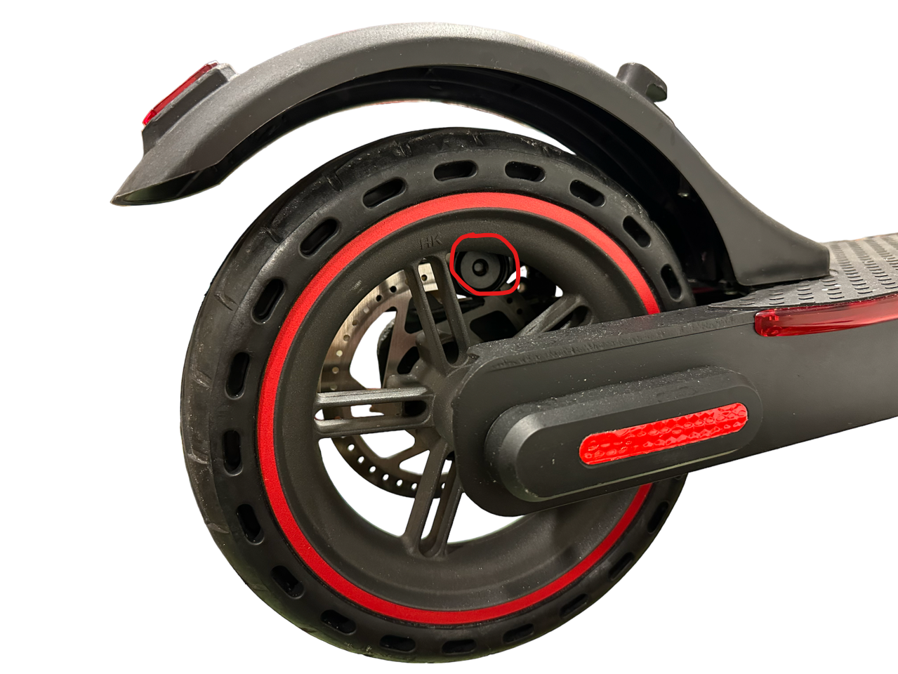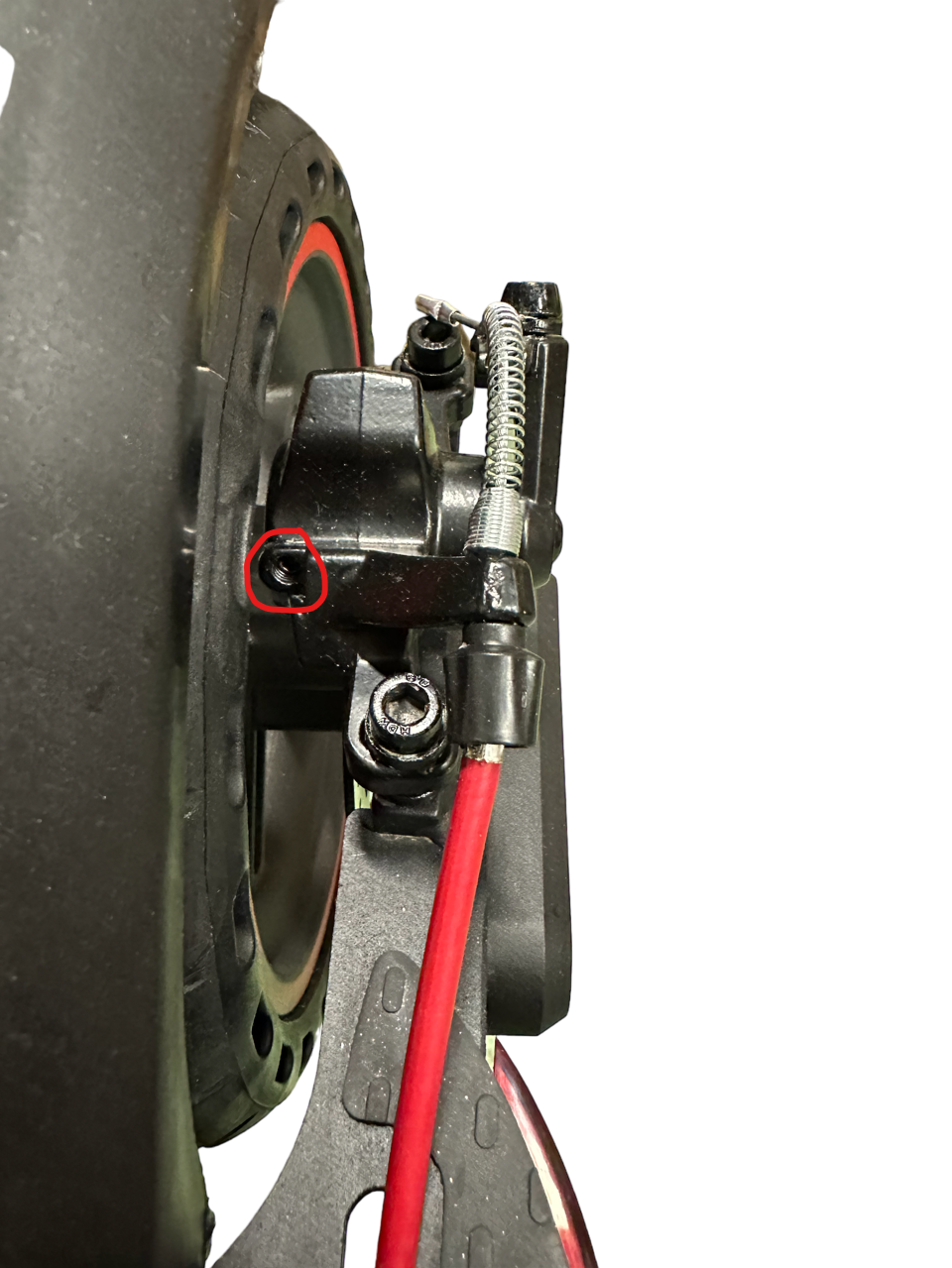 2. Justera den markerade skruven genom att skruva på den med en insexnyckel. Justera så att bakhjulet gnuggar lite mot bromsbelägget när du snurrar bakhjulet