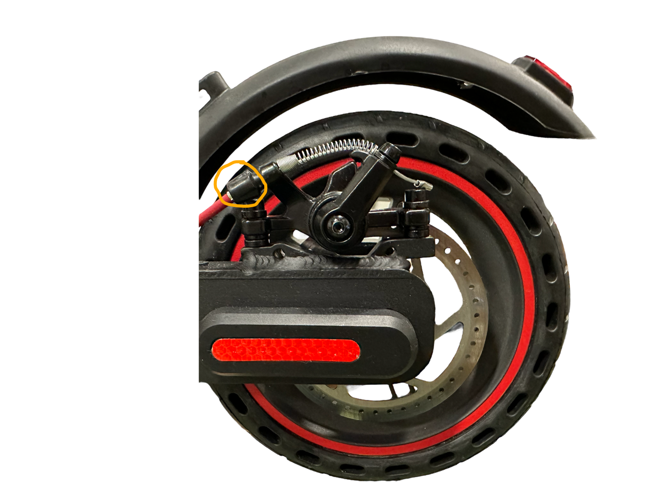 1. Skruva utåt på orange markerad skruv fram tills att bromsen ligger på och bakhjul ej går att snurra. Släpp sedan på skruven genom att skruva inåt för att hitta läget där bakhjulet snurrar fritt. Ta lite åt gången och försök snurra bakhjulet fritt för att hitta läget.